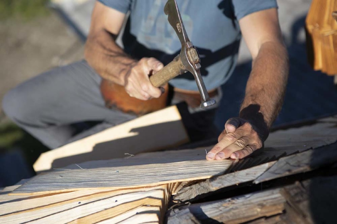 Sur les toitures des chalets d'alpage, avec mon équipe je mets à disposition ce savoir-faire ancestral qui est le métier de tavillonneur. La réfection d'un toit s'avère toujours une opération unique qui demande beaucoup de feeling. Une fois sur le toit, assis sur la chaule je saisis quatre tavillons d'épicéa que je dépose en éventail, tel un joueur de cartes dévoilant son jeu, avant de les clouer une par une à l'aide de ma martèle. Je tiens cette technique bien particulière du Cerniatin Camille Charrière. C'est auprès de lui que j'ai appris le métier durant plusieurs années.