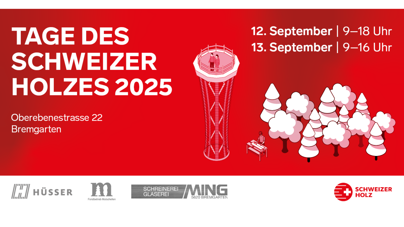 Am Freitag, 12. und Samstag, 13. September 2025 öffnen wir unsere Türen in Bremgarten. Zwei Tage lang steht alles im Zeichen von Schweizer Holz – von der nachhaltigen Waldwirtschaft bis zum fertigen Produkt.