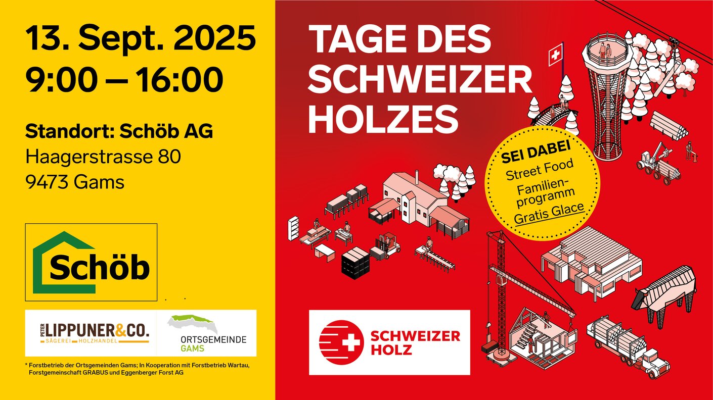 Am Samstag laden die Schöb AG, die Sägerei Lippuner und der Forstbetrieb Gams zur grossen öffentlichen Veranstaltung ein – ein Tag voller Erlebnisse rund um den nachhaltigen Werkstoff Schweizer Holz.