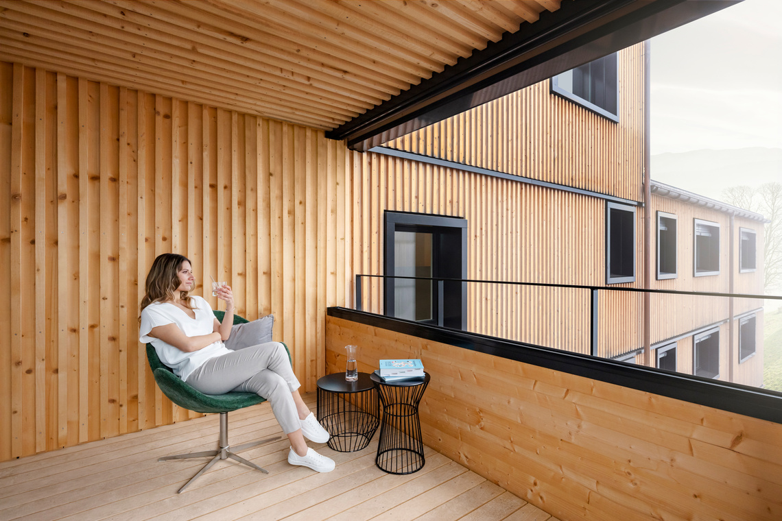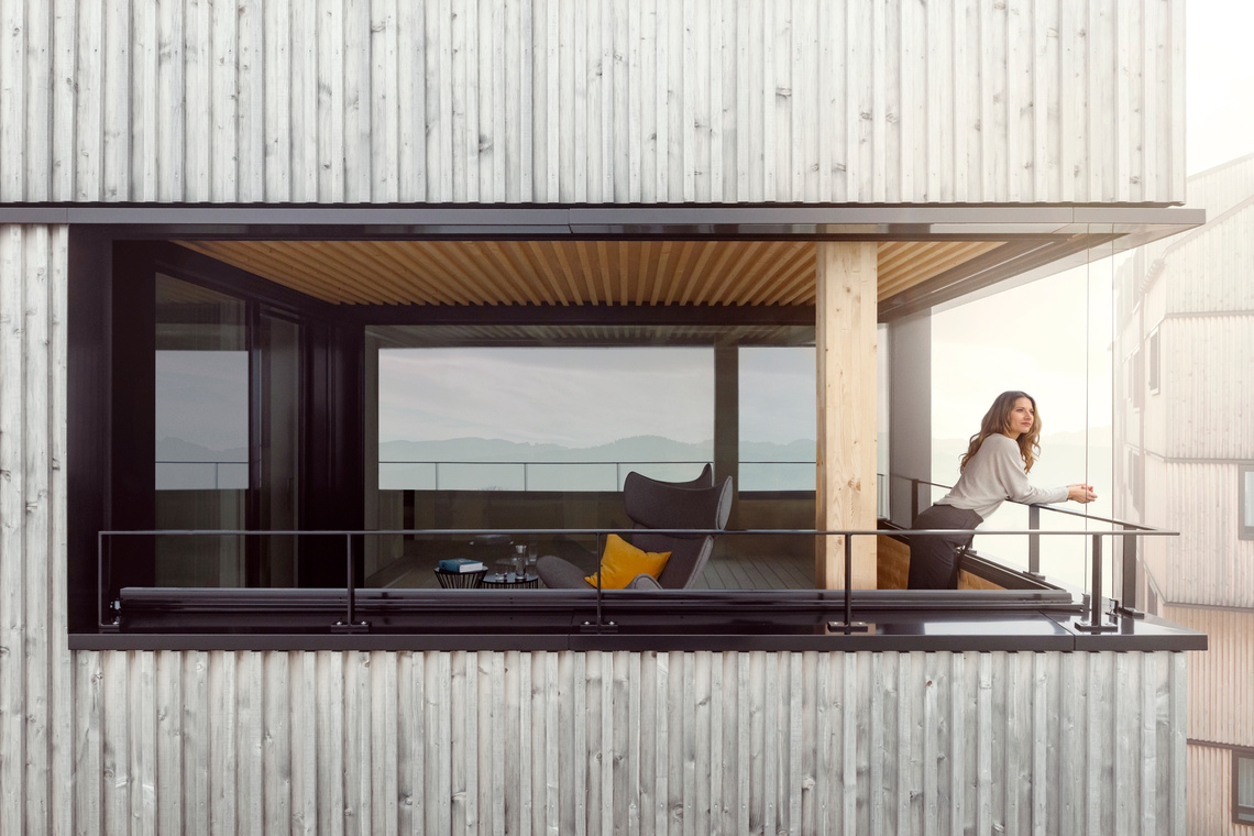 L’architecture urbaine contraste singulièrement avec le paysage rural, pour un résultat impressionnant. Le bois d’épicéa provient des forêts zurichoises et jette ainsi un pont entre le domicile et le lieu de travail de la jeune femme. C’est dans le calme de son village qu’elle se ressource, loin de l’agitation et des contraintes de la vie professionnelle.