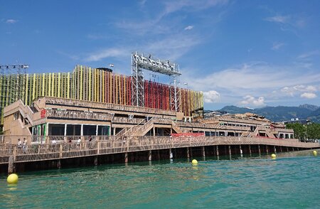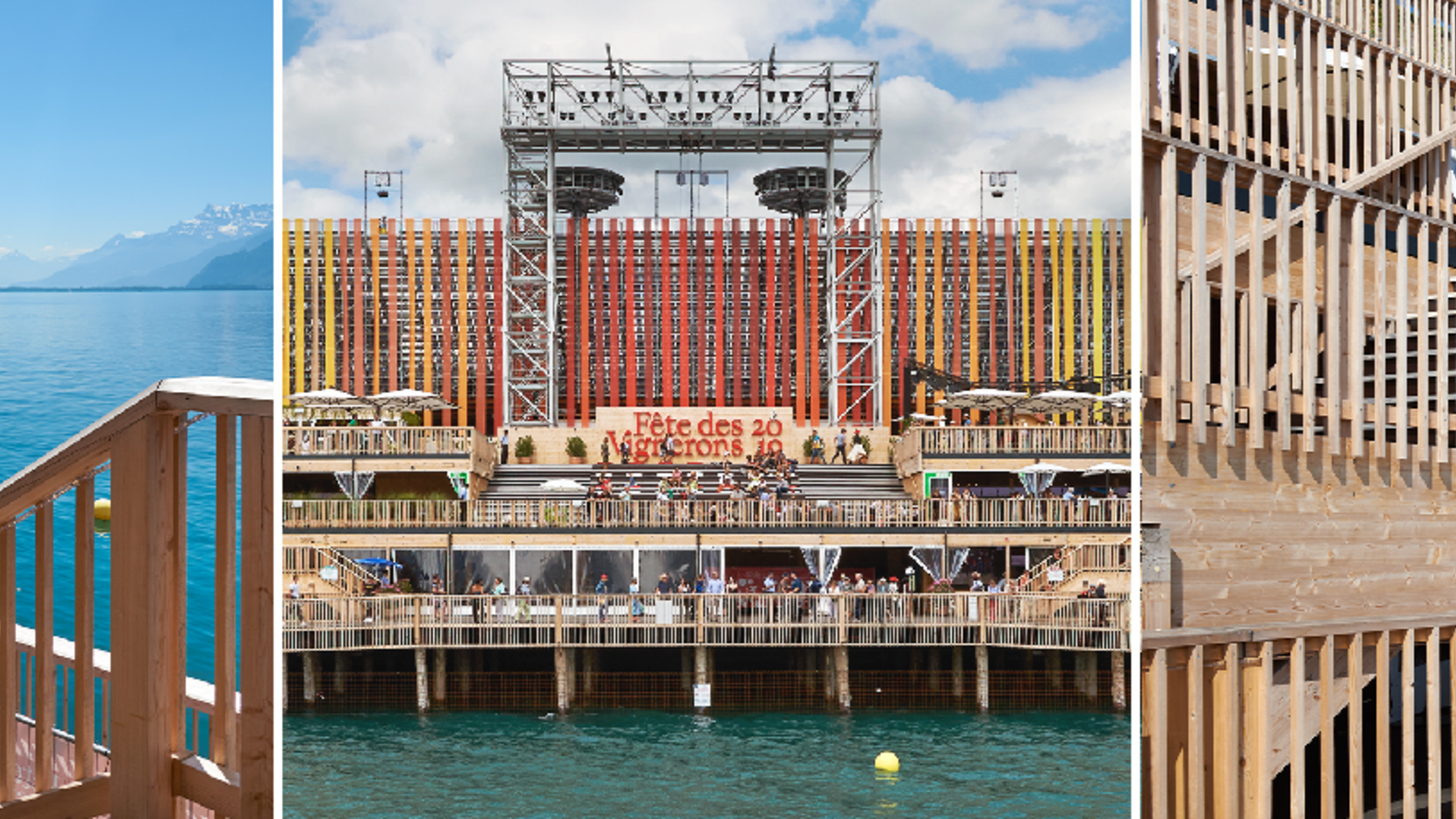 La structure porteuse en bois comprenant la plateforme sur le lac, ses étages supérieurs, ainsi que la passerelle était sous notre responsabilité. Elle mesurait 125m par 30m, dans un assemblage de bois et d’acier, et était fondée sur pieux. La surface en bois correspondait à 500m³ soit 500 troncs d’arbres au total, et ceci sans compter les 3 niveaux de bâtiments la surplombant.