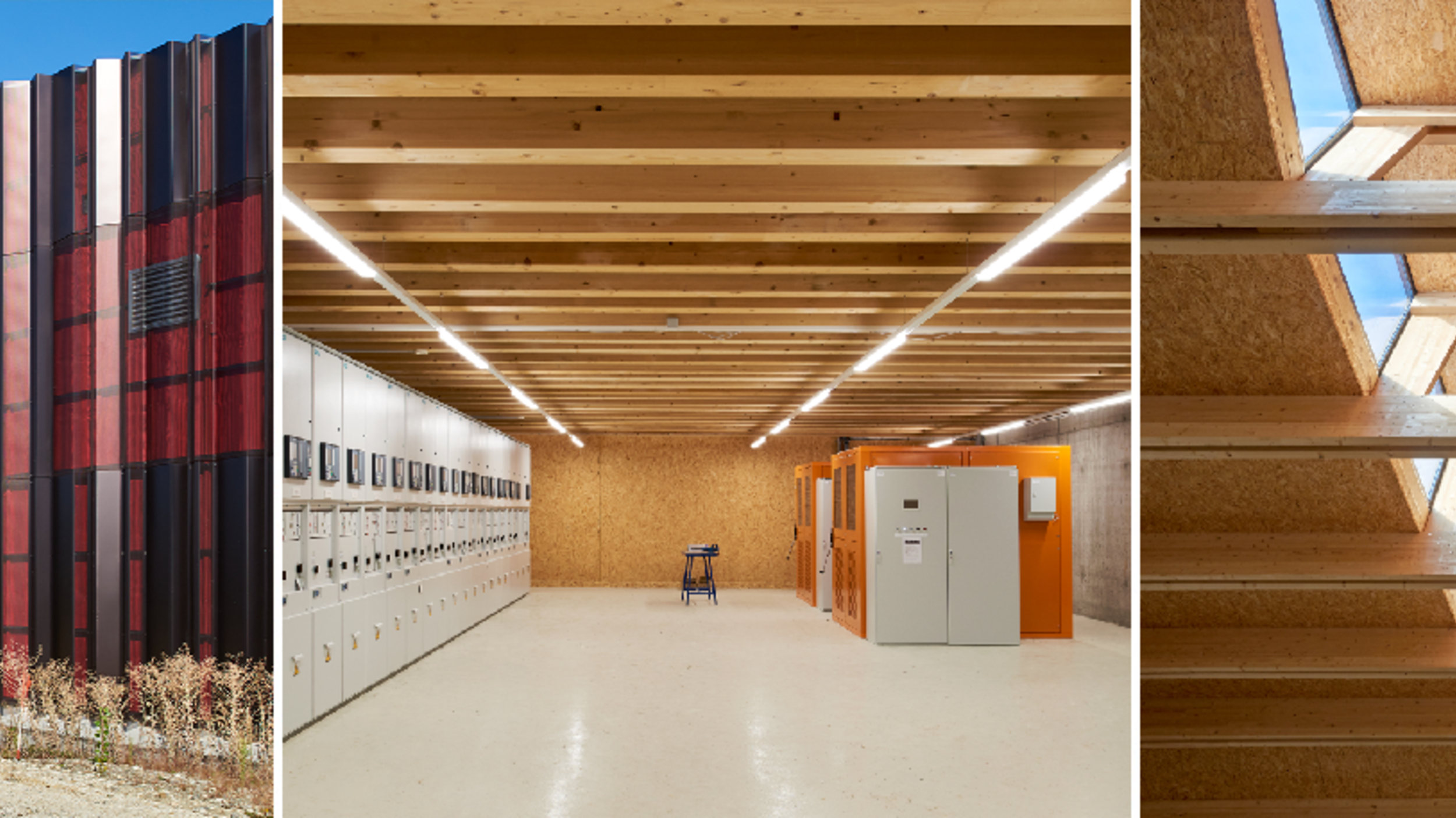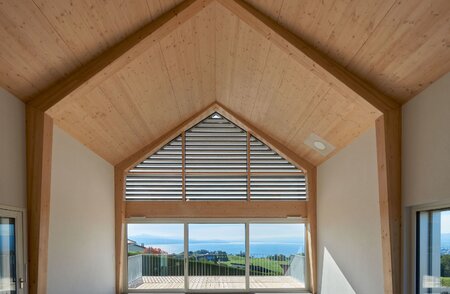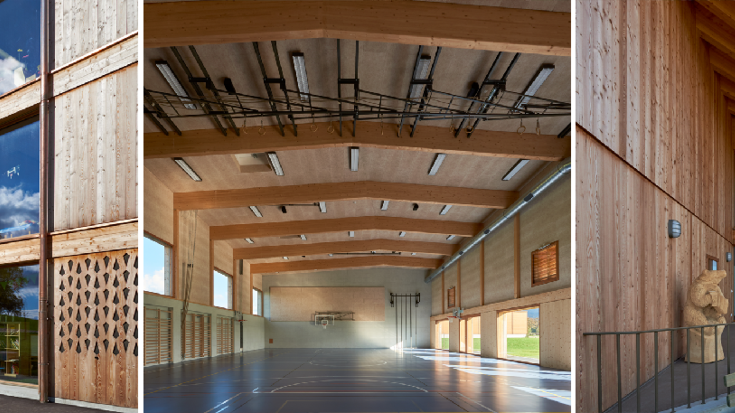 En effet, le radier, le sous-sol, la dalle sur sous-sol et les murs contre terre ont été réalisés en béton armé coulé sur place. Cependant, la structure hors-sol est entièrement en bois et est rythmée par des portiques Blc à inertie variable. De plus, les murs à ossature bois préfabriqués en usine sont sortis avec un haut niveau de finition puisque le doublage intérieur a été réalisé en atelier. Finalement, la dalle du premier étage a été laissée apparente et les panneaux de toiture ont eux aussi été préfabriqués en usine et réalisés avec des panneaux trois-plis apparents.
