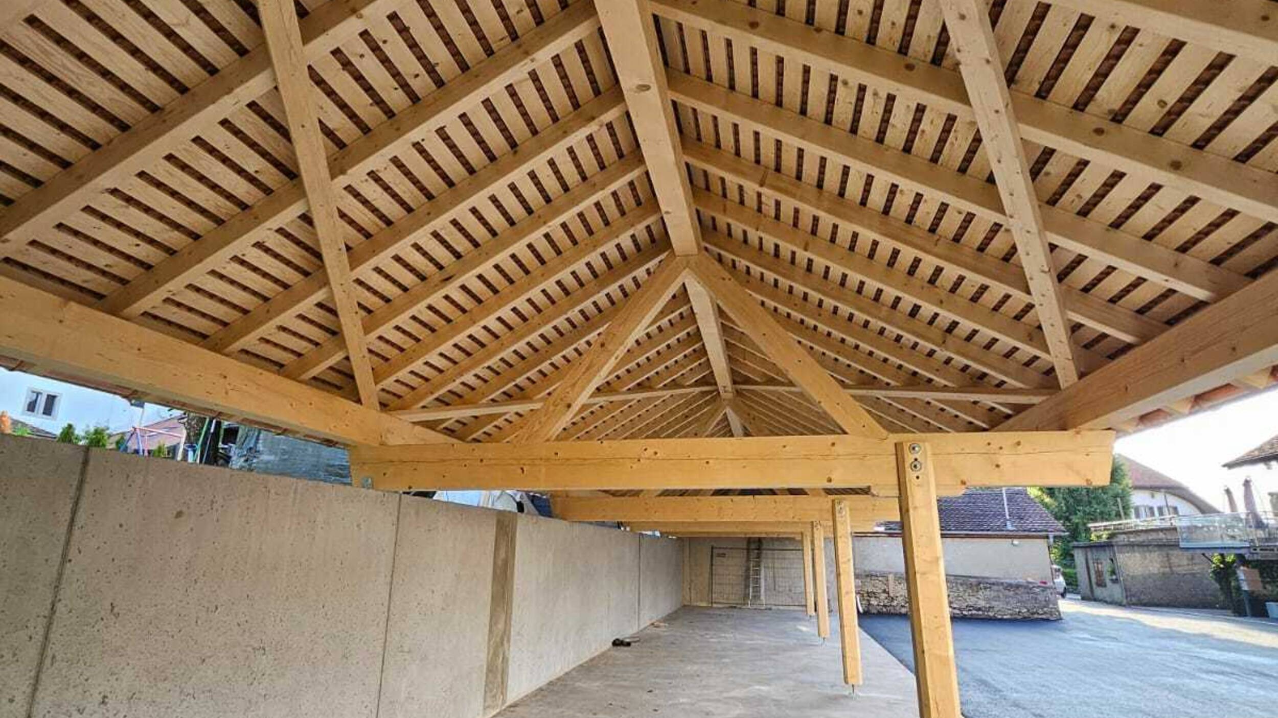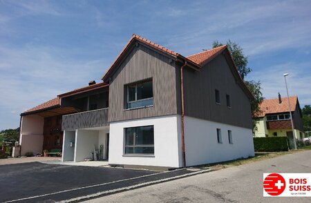 Charpente, sous-toiture pour combles froids, isolation et plancher sur dalle, séparation de cave, lame de façade et paroi pignon garage, ferblanterie-couverture, panneaux photovoltaïque, immeuble labélisé COBS Bois Suisse