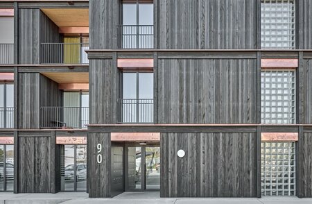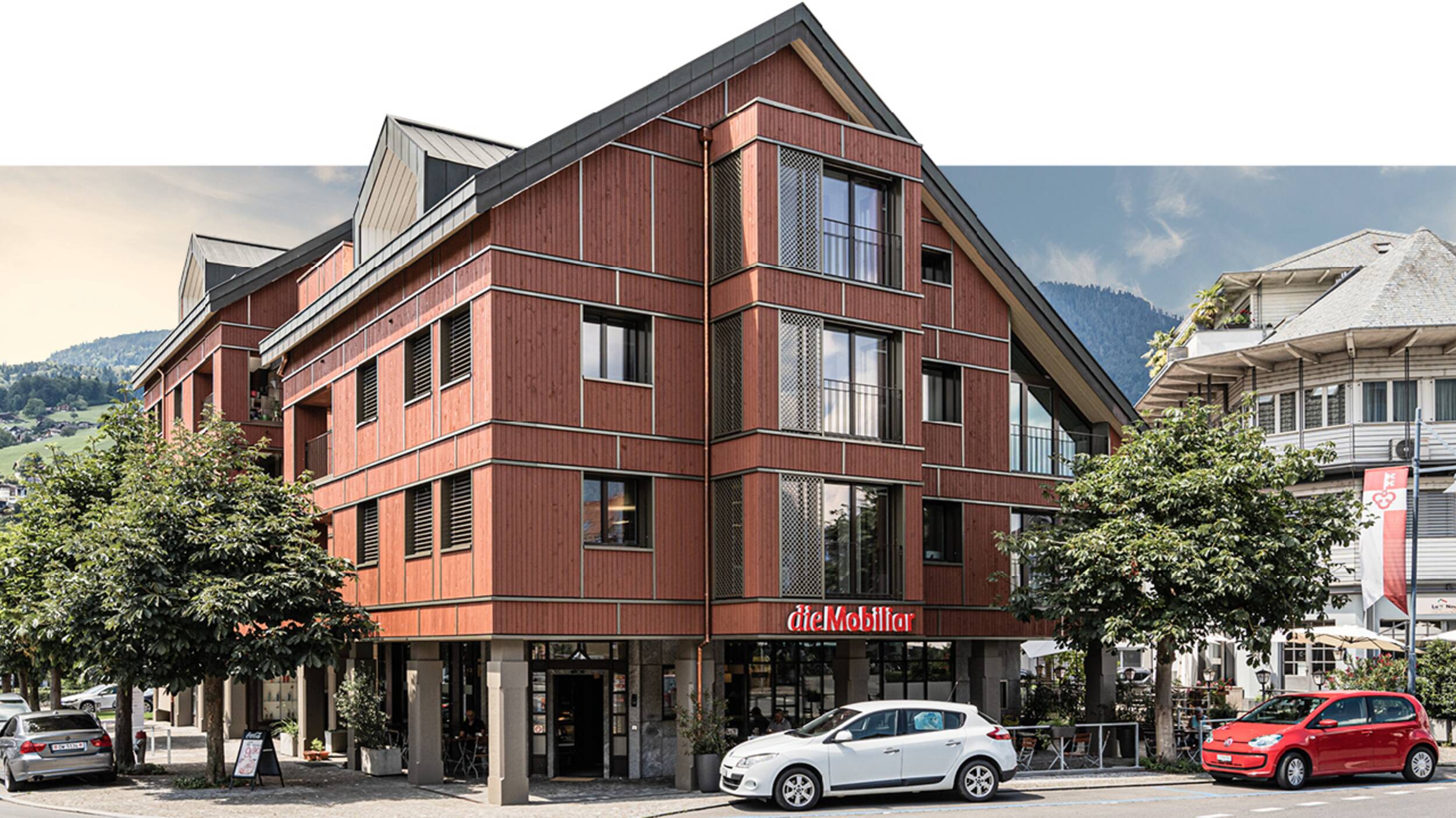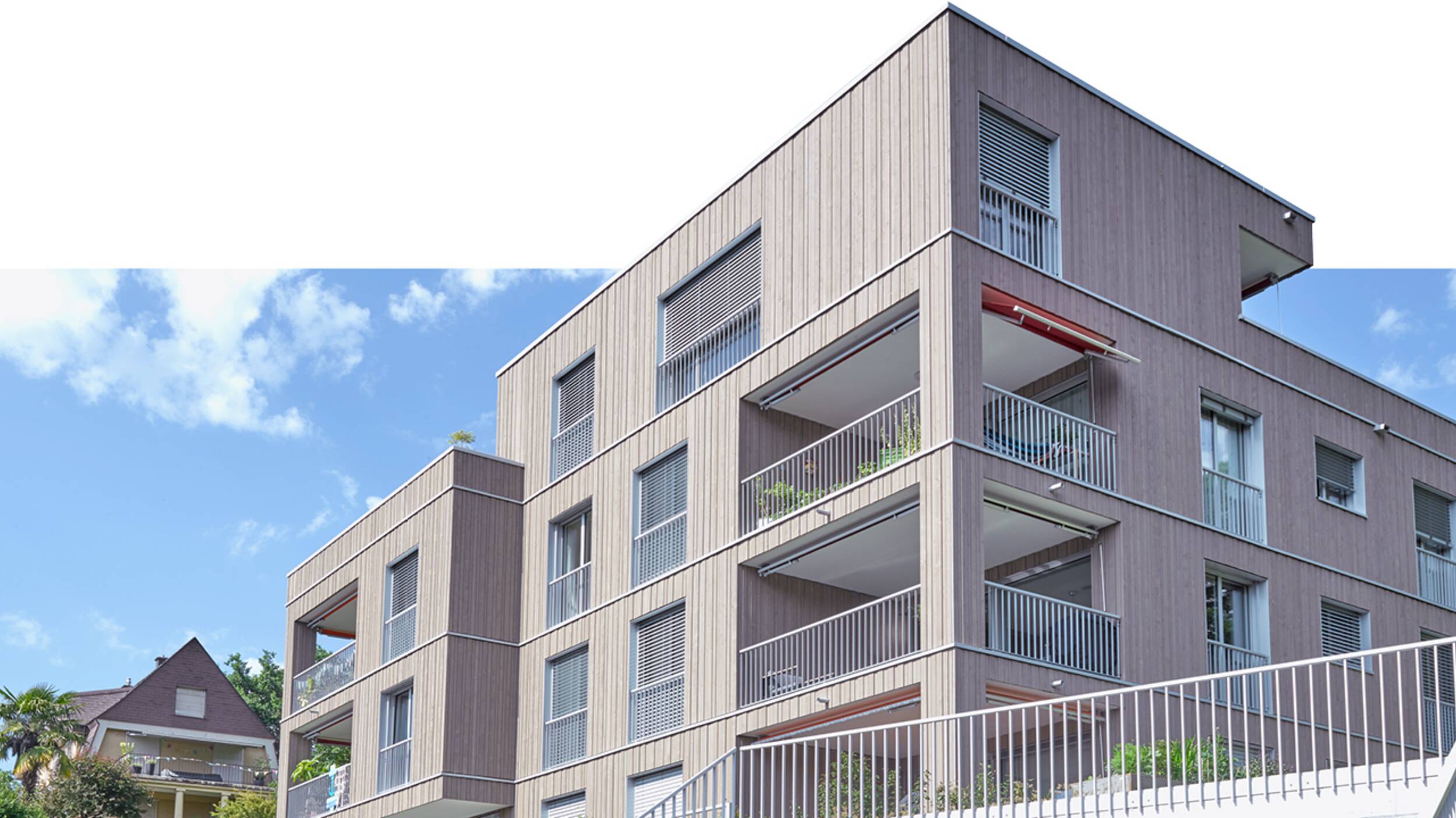 Kompletter Holzbau ab Betonplatte über Einstellhalle mit der Besonderheit, dass auch der Liftschacht und die Treppenhäuser in Holz ausgeführt sind.