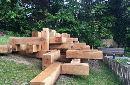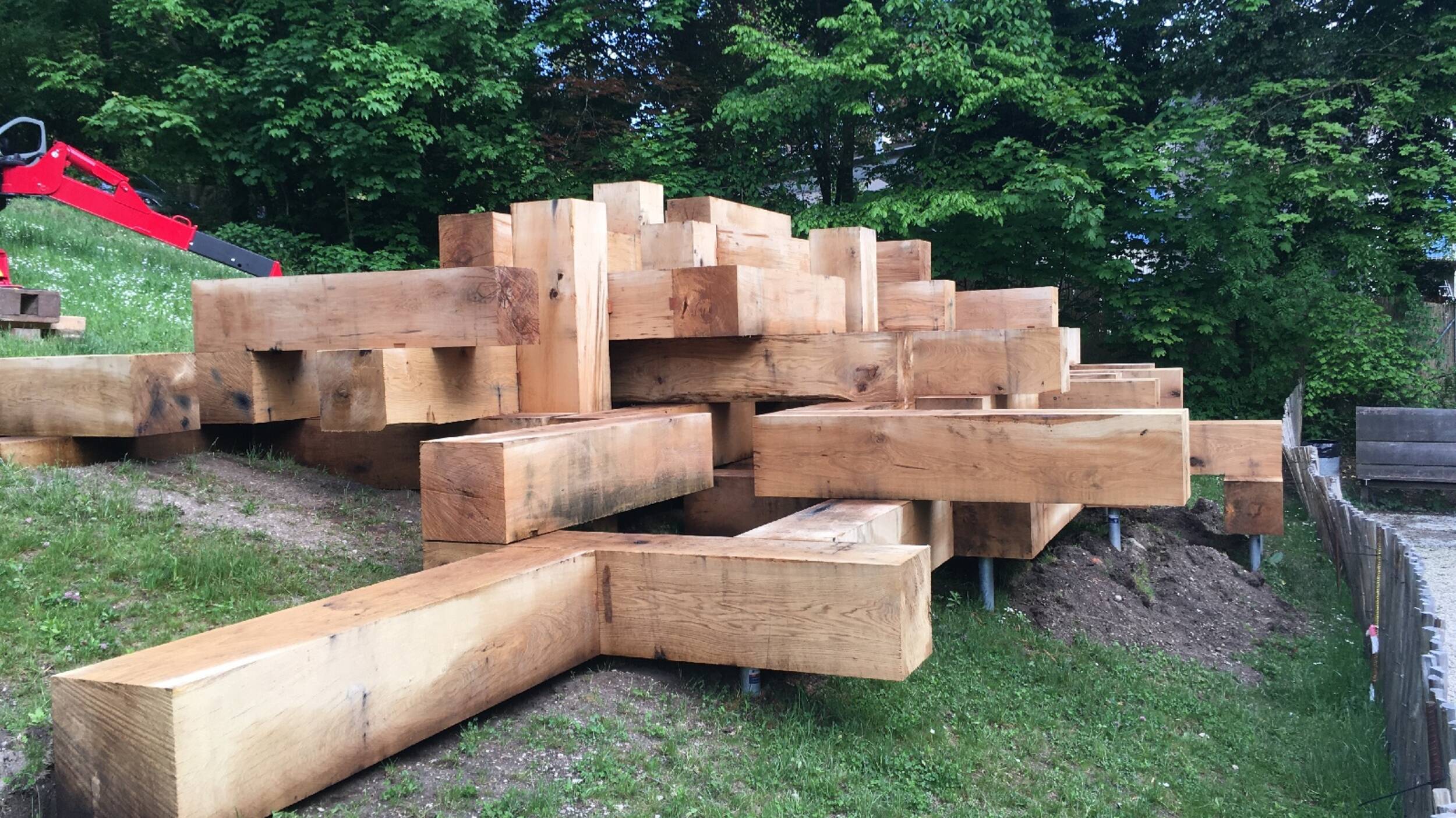 Mandatés par la Société des Nouveaux Commanditaire Suisse pour l'étude et la pose de cette oeuvre monumentale imaginée par Les Frères Chapuisats. Il s'agit de 82 éléments de chêne 40/40cm par 2m de long assemblés entièrement par des inserts en chêne. Le tout repose sur des vis de fondations afin de ne pas impacter le sol.